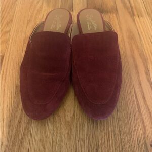 Elegant deep red mules by Seychelles. Slip-on design for easy wear. Perfect blend of style and comfort.