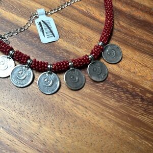 Elegant red beaded necklace with silver coin accents. Perfect for adding a touch of sophistication to any outfit.