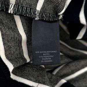 Shift style. Black and white striped print. Lantern sleeves. Zips at the back.