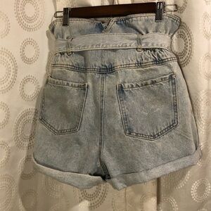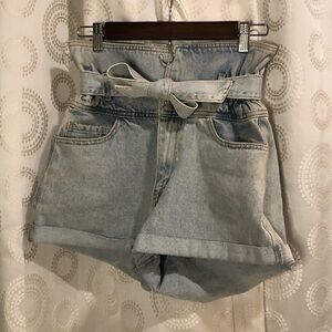 Stylish high-waisted denim shorts with a chic belt. Perfect for casual outings. Available in classic blue.