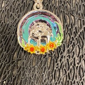 Mother/daughter silver necklace featuring a Mommy carrying baby elephant pendant with blue purple and orange background accents.