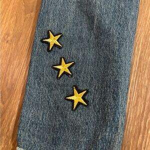 Stylish blue jeans with distressed details. Features unique patches for added flair. Perfect for casual wear.