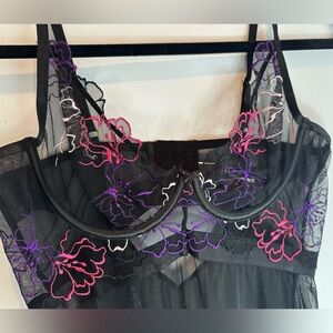 This unlined lace babydoll features a colorful embroidery, fully adjustable straps.