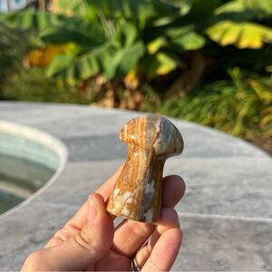 Add a natural touch to your decor with this elegant stone mushroom figurine. Its tan and brown hues bring warmth and sophistication to any room.