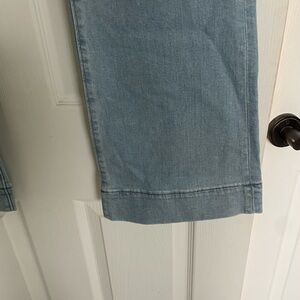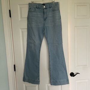 Stylish light blue flare jeans with wide hem. Comfortable and versatile with stretch.