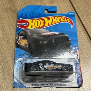 Experience the thrill of racing with the Hot Wheels '10 Ford Shelby GT500 Super Snake. This sleek black toy car is perfect for young car enthusiasts.