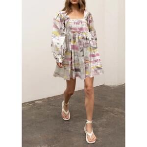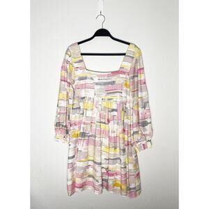 Moon River x Anthropologie Women's Babydoll Dress Balloon Sleeves Square Neck Abstract Print Pink White Yellow Gray Beige Hidden Side Zipper Lined • SIZE: L • PIT TO PIT: 19” • LENGTH: 36.5” • CONDITION: VGUC (3070)