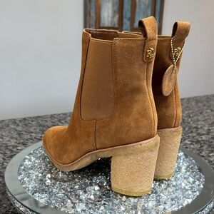 Elevate your footwear collection with these Lauren Ralph Lauren ankle booties, crafted in a rich tan suede. Featuring a classic Chelsea boot design with elastic side panels, these booties offer a sophisticated look and easy wear. The medium-height block heel adds a touch of elegance, making them perfect for any occasion.