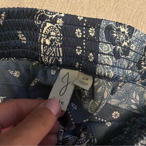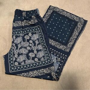 These Joie women's pants feature a blue bandana paisley block print in satin fabric. They have a relaxed fit with a wide-leg style and a high rise. The pants are designed for casual wear with an elastic waist and pockets. Perfect for a coastal grandma or anyone looking for comfortable, lightweight pants with a bohemian flair 🐚🌊🌼