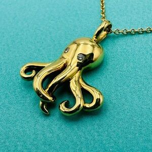 Impossible to find. Stunning octopus charm crafted in 18K yellow gold with two round brilliant diamonds as its eyes. On 18” yellow gold chain. Excellent condition. I see some minor marks under a magnifying loupe but nothing truly obvious to a naked eye. Has never been polished. Only one owner. Comes with brand new Tiffany presentation packaging pictured - blue leather box, outer box, ribbon. Always authentic. Offers are not considered for this piece as it’s a rare collector’s jewel.