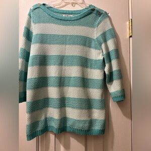 Stylish knit sweater by Croft & Barrow. Features teal and white stripes. Comfortable and chic. Buttons on shoulders. Machine washable. 3/4 sleeves