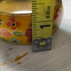 Gold tone brass & painted enamel floral bangle bracelet. Looks hand painted - brass is distressed and yellow enamel with floral. There is some cracking on enamel - pictured - that can be seen up close - but still a great bracelet. Preowned condition please check all pictures.