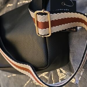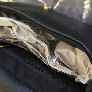 Elegant black crossbody bag with gold accents. Perfect for any occasion.