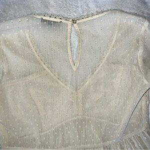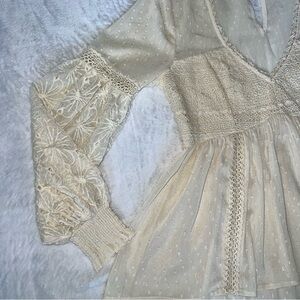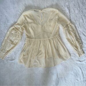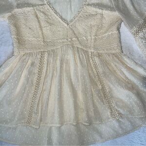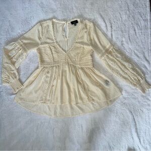 Chic cream blouse with lace accents. Features a flattering V-neck and long sleeves. Perfect for elegant or casual occasions.