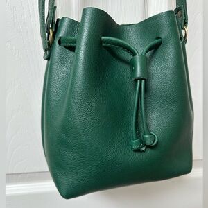 The Small PL Bucket Bag in the beautiful Bacalar Green is the perfect crossbody to add some flare to your outfit! **This bag style has been retired and is no longer available online** I had 2 extra holes professionally added to offer shorter strap options when worn as a shoulder bag. The drawstring stays closed & secure once pulled shut. Lightly worn & in excellent condition. 2 small scuff marks are on the front which you can see slides 10 & 11 on the zoomed in pictures. Portland Leather items will show marks over time as you wear the bag.