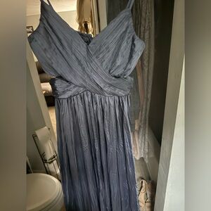 Elegant blue midi dress with a pleated design. Features a flattering V-neck and adjustable straps. Perfect for any occasion.