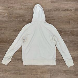 A cream hoodie will keep you nice and warm. This jacket comes to you in good condition! Just looks to be worn a few times. Faded discoloration on back hood of hoodie and back sleeve (both picture), not very noticeable. Still wearable! Open to offers!