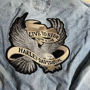 Classic Harley-Davidson denim jacket. Light blue with button closures. Features chest pockets and logo patch. Men’s size XXXL. In good used condition. Does have some fading, but all in all good condition.