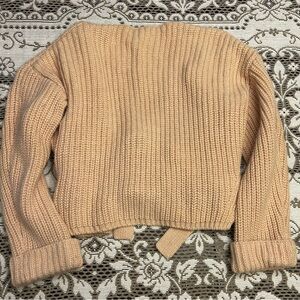 Cozy chunky soft knit crossover wrap cardigan. Open front with belted adjustable tie waist. Drop shoulders. Super Cute and Chic! Can be worn off shoulder. Color is cream with subtle peach/pink blush. Acrylic/Nylon/Poly blend. Gently used - no holes, tears, snags or stains. Great condition. Oversized Medium.