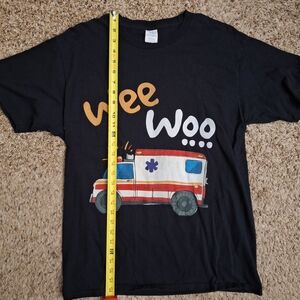 Vintage funny black Port & Company ambulance t-shirt with "WEE WOO" design, size L. Slight cracking on image due to normal wear, but pretty unnoticable.