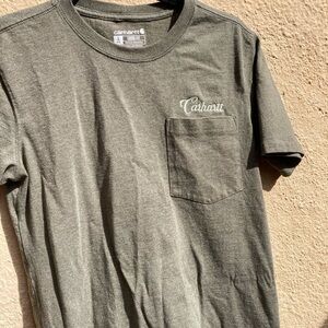 Women's Carhartt T-Shirt Green Spell-Out Cursive S Crew Cotton Pocket Cursive Workwear. Cotton Blend. Pocket.
