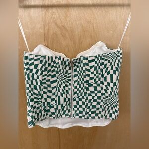 Stylish strapless top with a green and white checkered pattern. Beautiful boning detail for excellent structure. Perfect for casual outings. Lovely condition. Like new.