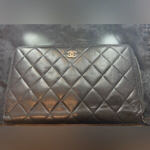 Sophisticated CHANEL wallet in black quilted leather. Features iconic logo detail. Perfect for stylish essentials.