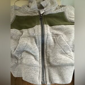 Comfortable and warm gray zip up hoodie with a stylish green panel. Ideal for casual outings on chilly days. In good, preowned condition!