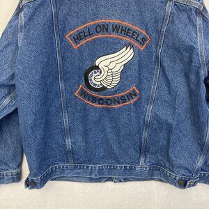 Vintage Carhartt Denim Jacket Mens 3XL TALL Blue Hell on Wheels Wisconsin Biker 90s