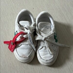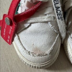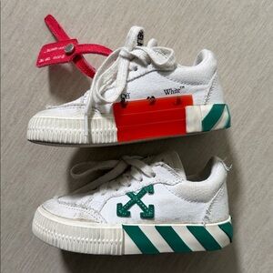 Stylish white sneakers featuring green accents and a distinctive red tag. Perfect for casual wear.