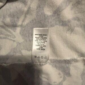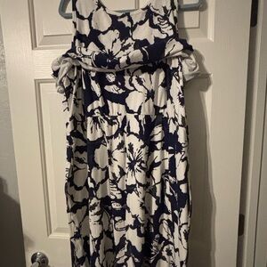 Chic dress with navy and white floral design. Perfect for everyday wear. This dress has an over material top. I tried to show it as I lifted it so the material goes up under and then the top lays down over your chest. It has a nice flow. There are pockets on each side, it’s a great dress to wear with a little light jacket. Non-smoking house.