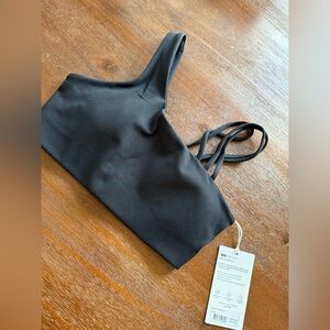 Stylish black sports bra with unique strap design. Perfect for workouts.