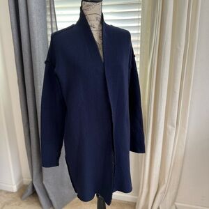 Chic navy blue cape with open front. Ideal for layering. Adds elegance to any look.
