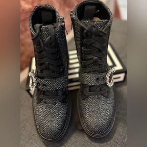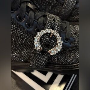 Jimmy Choo Cora Tweed Embellished Flat Ankle Boots NWOT. Cora Flat/Crystal Marl Grey Glistening Tweed And Black Calf Leather Combat Boots With Crystal Buckle.