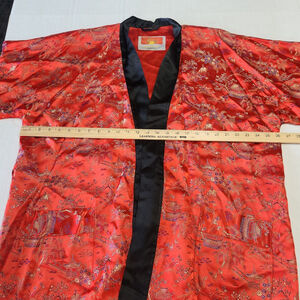 Vintage Oriental Kimono Robe L Red Black Satin Asian Print Lounge Duster Boho