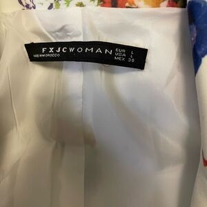 Elevate your style with this stunning floral blazer. Perfect for any occasion, this blazer features a vibrant floral pattern on a white background, adding a touch of elegance to your wardrobe. NEW w/o Tag!