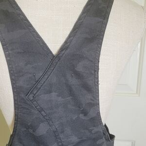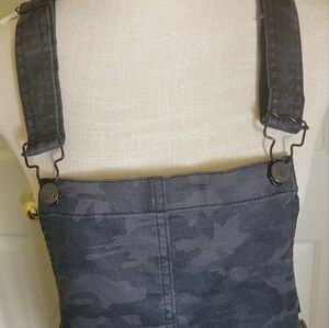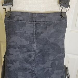 Part skirt, part overalls, and all fun, Vanilla Star's mini-length skirtall makes the fashion scene with a camo print and classic front-close shoulder straps.