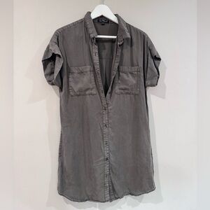 Features two front pockets, a relaxed fit, and rolled short sleeves. Can be worn as a dress, long tunic, or layered with jeans for a laid-back look.