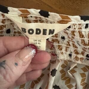 Boden Smocked Neck Beach Kaftan Dress in a size 8 Long. In the color Geometric Cashew Trance. Lightweight cotton. Smocked neckline with tasseled ties. Full elastic banded sleeves. 100% cotton. Measures approximately 22” armpit to armpit and 37” in length. In great condition.