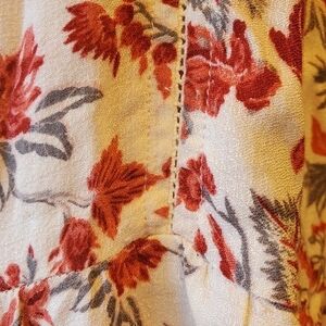 Peplin cut blouse with themes reds and deep pinks and grays excellent pre own condition a high low cut pepperland design on sleeve and at him gathersley for better fit very slight lace detail down front of blouse and on back.
