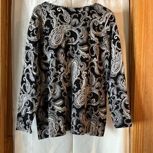 Croft & Barrow Women’s Stretch Comfy Sz 1X Comfy Multi-Colored ( Black/gray, light beige/off white) Paisley Tee. Long Sleeve, Crew neck, 100% cotton, lightweight-stretch, soft and comfy pullover. Perfect choice for any season. Following measurements are approximate: Pit to Pit 22” Sleeve Length 23 1/2” Length 27”. Preowned in good condition.