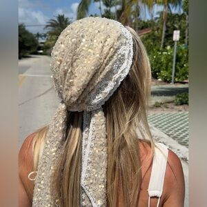 Elegant sequin lace headscarf in beige and white. Perfect for adding a touch of glamour.