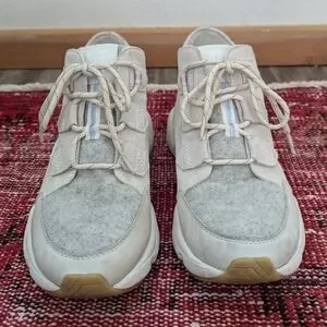 Elevate your style with these chic women's sneakers. Featuring a blend of cream and gray, these shoes offer both comfort and fashion-forward design. Perfect for any casual outing.