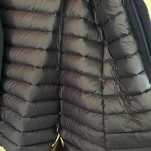 Insanely warm. Hits mid-thigh on someone 5’4”. Insanely warm. XS. Zero flaws.