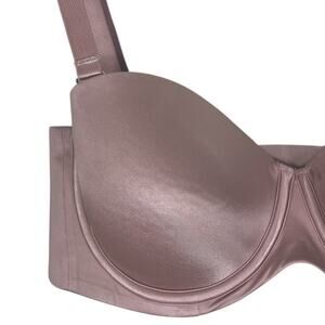 A satin, lightly lined, underwire bra that can be worn strapless or with straps that are convertible. A light pink purple color. Size 36D