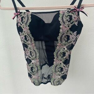 Features pink and black bows, adjustable straps, multicolor floral embroidery, padded bust, mesh torso and hook and eye closure. Made in Italy. Excellent condition! Women’s size 34B