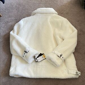 Chic faux fur coat. Features a cozy collar and sleek buckle details.