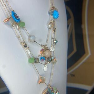 This stunning layered necklace features a blend of vibrant colors, perfect for adding a pop of color to any outfit. The intricate design showcases a mix of blue, green, and gold tones, making it a versatile accessory for any occasion.