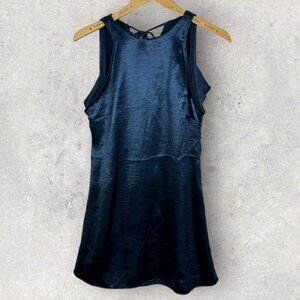 Free People Blue Satin After Hours Slip Dress in Women's Size Small. Retails for $60 USD (approximately $84 CAD). Has an open back with ruffle details. Minimal shine A-line dress that features a high neck and an open back with a statement ruffle trim. Adjustable tie back. Mini length. Button clOne Sizeure in back. Machine washable. Made in Vietnam. Brand new with tags. No flaws.