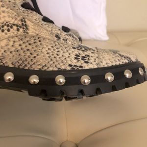 Schutz snakeskin leather boot is NWB, size 6.5. The Andrea combat boot in natural snakeskin embossed leather features stud details, inner side zip up closure, lightly padded leather insole, rubber lug sole, 2 in heel, 6.2in shaft, 10in boot circumference. Tons of cool personality, black lace up. Includes dust bag. Thanks for checking out! 🥂💕